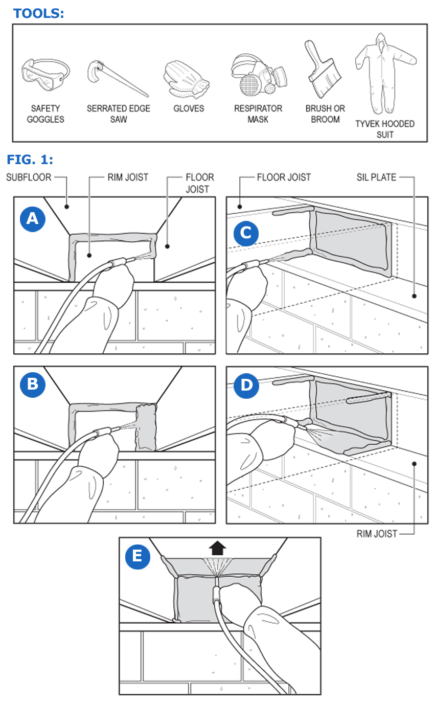 3) Apply closed cell foam to achieve 1” cured layers to desired thickness, sprayed directly to the rim joist bay, connecting any seams at the sill plate up to the subfloor.